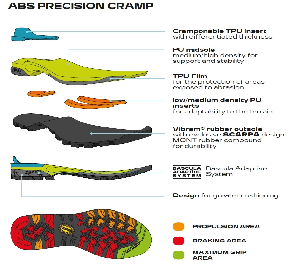 Talpa exterioara din cauciuc Vibram MONT asigura aderenta excelenta pe teren alunecos si stancos. Insertiile TPU protejeaza zonele expuse la abraziune, iar PU-ul de densitate medie ofera suport si stabilitate. Insertiile din PU de densitate joasa/medie se adapteaza la teren, imbunatatind absorbtia socurilor si oferind un plus de confort. Bocancii sunt compatibili cu coltarii semi-automati, fiind ideali pentru trasee tehnice si alpinism de dificultate moderata.